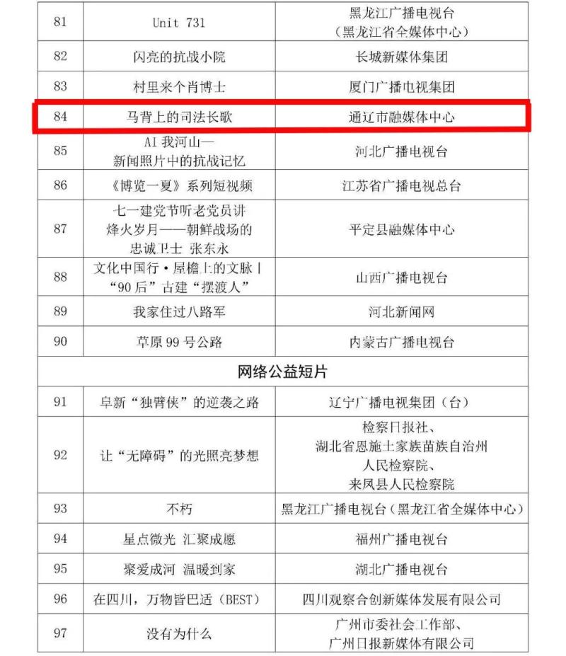 1月15日,國家廣播電視總局公布 2025 年第三季度優(yōu)秀網(wǎng)絡(luò)視聽作品推選活動(dòng)評(píng)審結(jié)果。其中,內(nèi)蒙古廣播電視臺(tái) 2 件作品、通遼市融媒體中心 1 件作品入選,全區(qū)共3 件作品上榜。